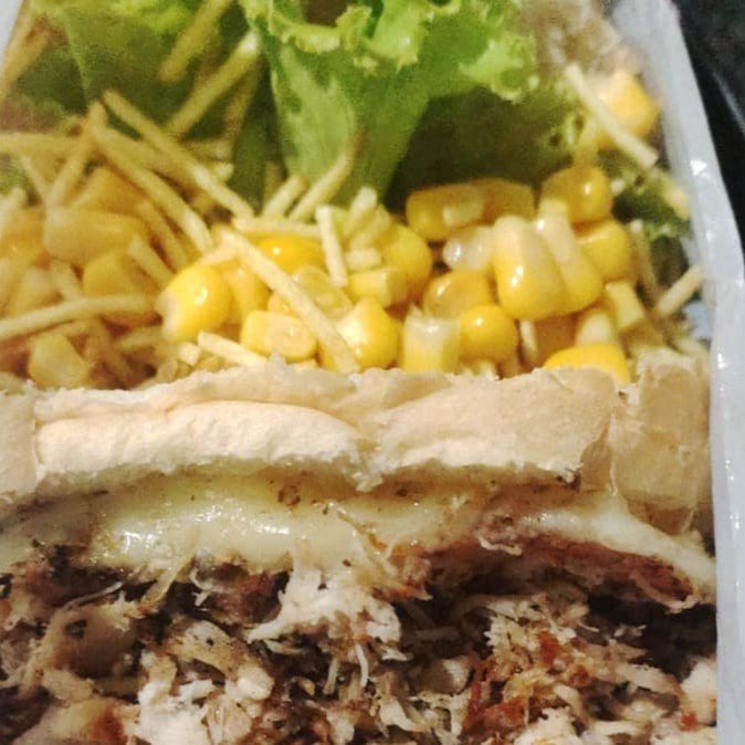 Pão, mussarela, peito de frango desfiado, presunto, tomate, alface, milho, batata palha.