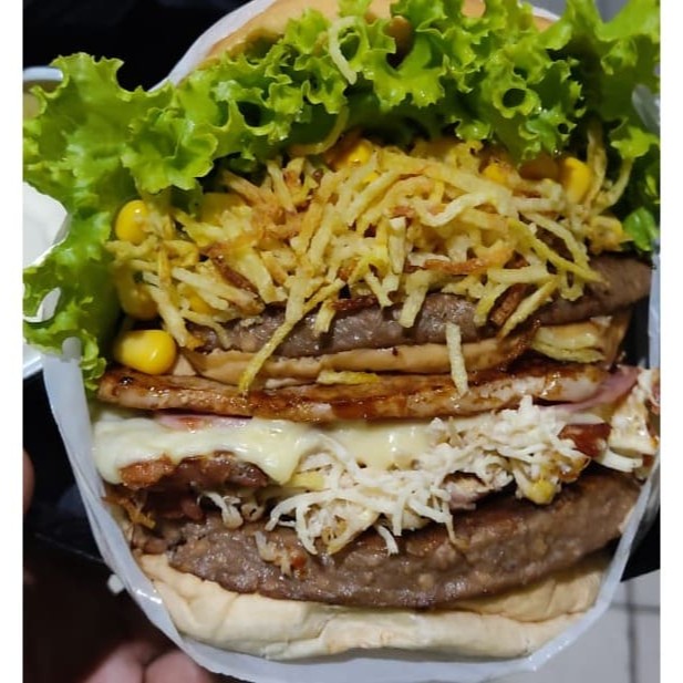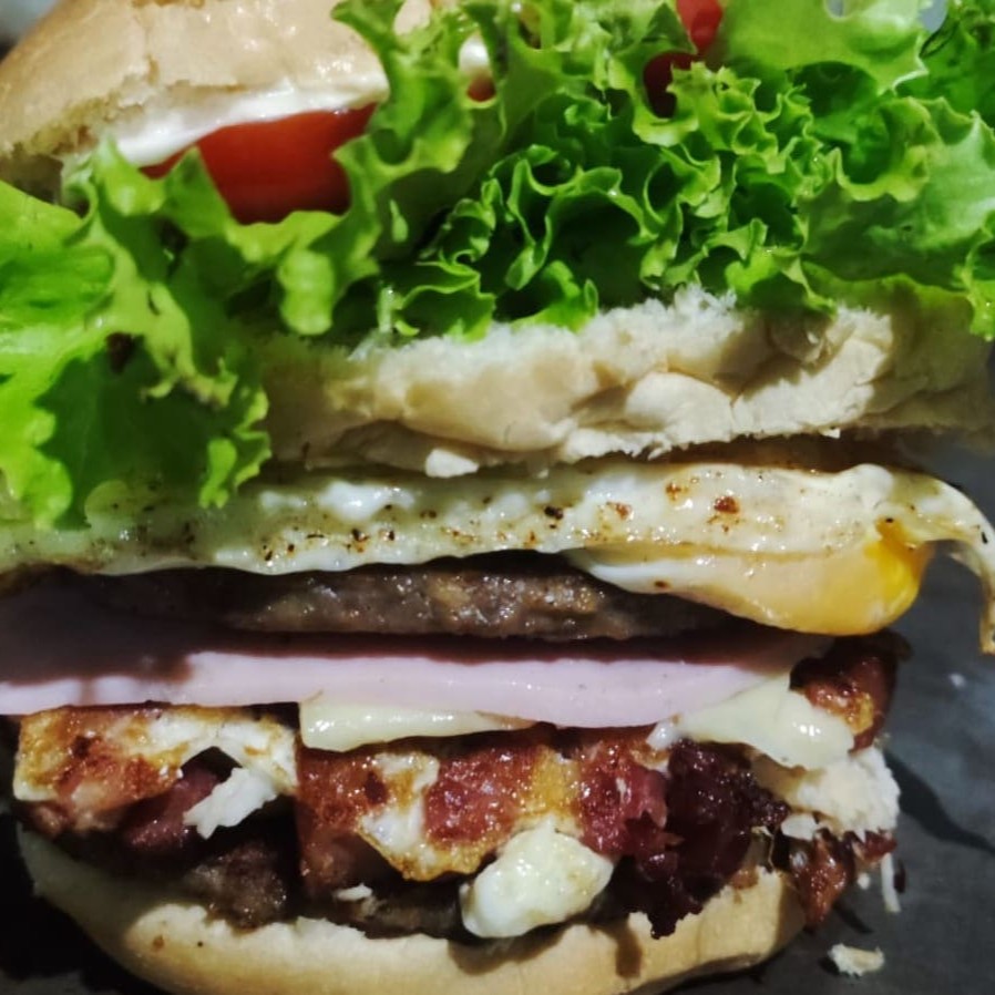 Pão, 2 hambúrgueres, mussarela, peito de frango desfiado, presunto, bacon tostado, 2 ovos, tomate, alface, milho, batata palha e maionese.