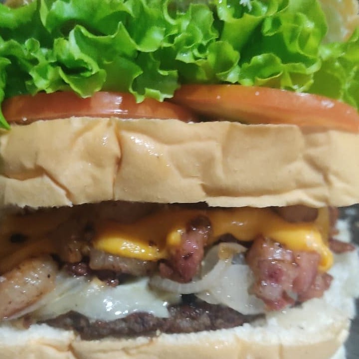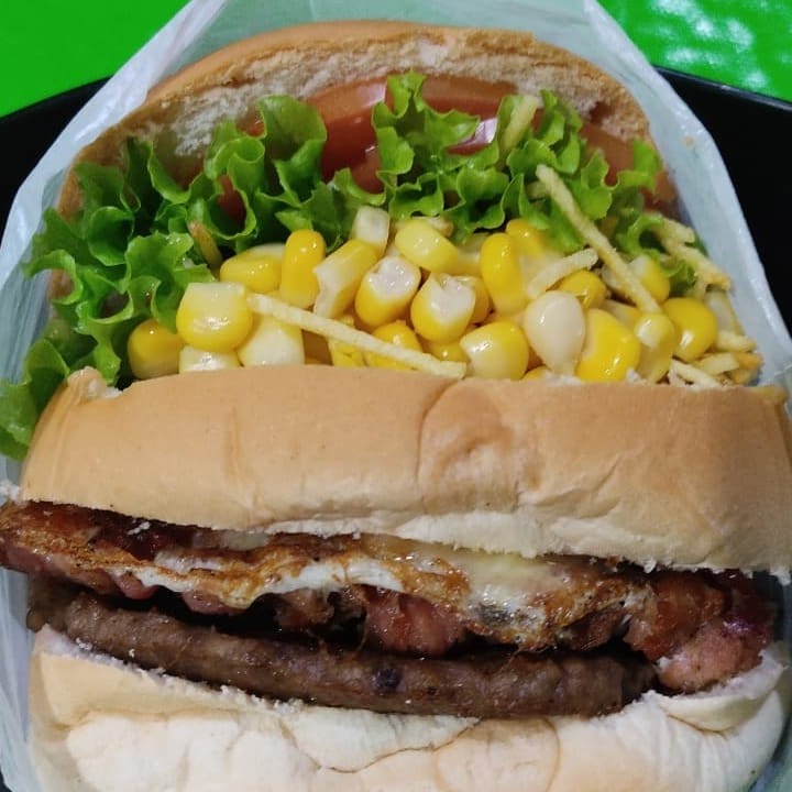 Pão, hambúrguer, mussarela, bacon tostado, ovo, tomate, alface, milho, batata palha e maionese.