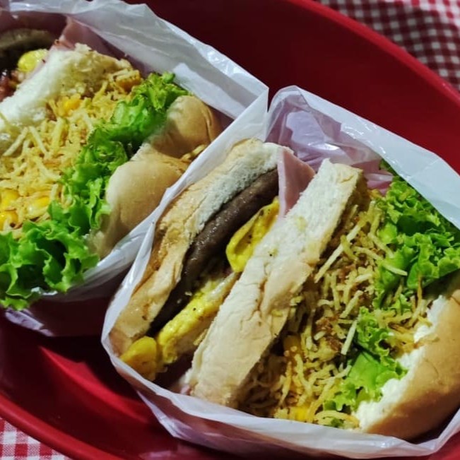 Pão, hambúrguer, mussarela, peito de frango desfiado, presunto, bacon tostado, ovo, tomate, alface, milho, batata palha e maionese.