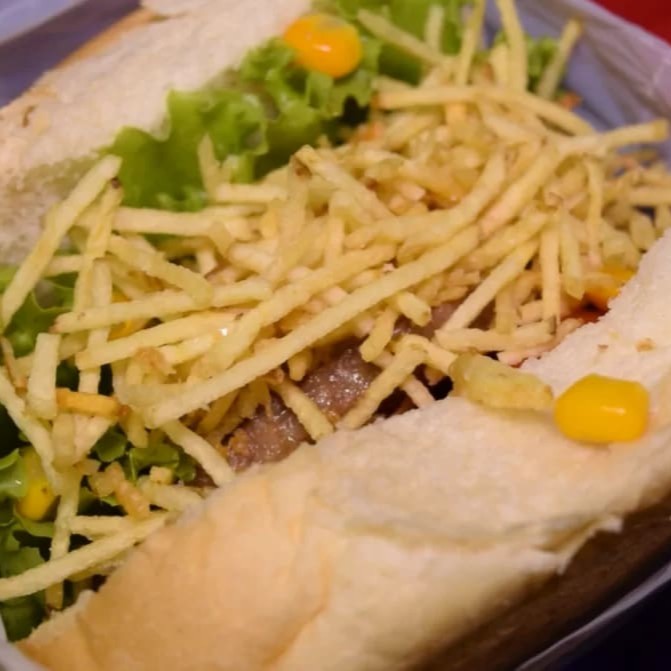 Pão, mussarela, ovo, Catupiry, abacaxi, tomate, alface, milho, batata palha e maionese.