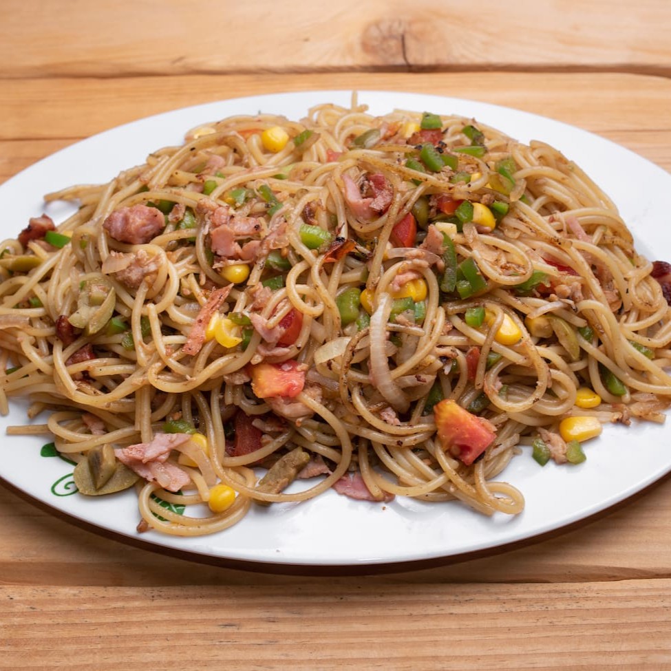 Macarrão, frango, bacon, milho, presunto, cebola, tomate, pimentão, azeitona, molho shoyo e molho alho.