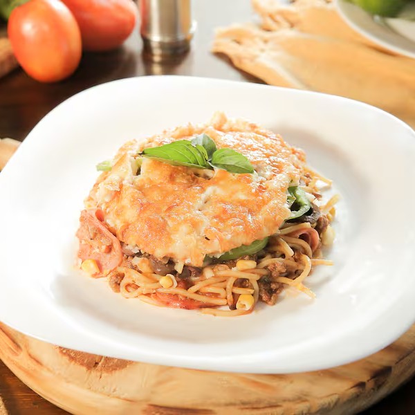 Deliciosos espaguetes com calabresa, milho, bacon, azeitona preta e queijo mussarela com molho à escolha.