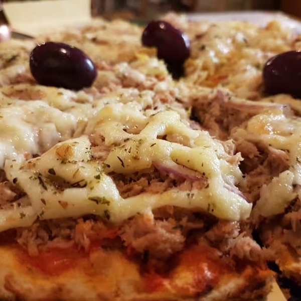 Massa Tradicional, Molho de Tomate, Muçarela, Atum, Milho, Catupiry, Tomate, Azeitona e Orégano.