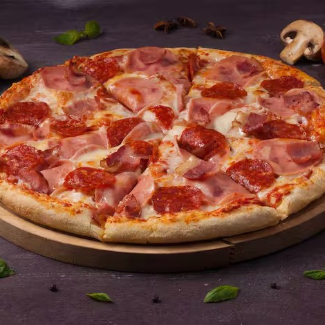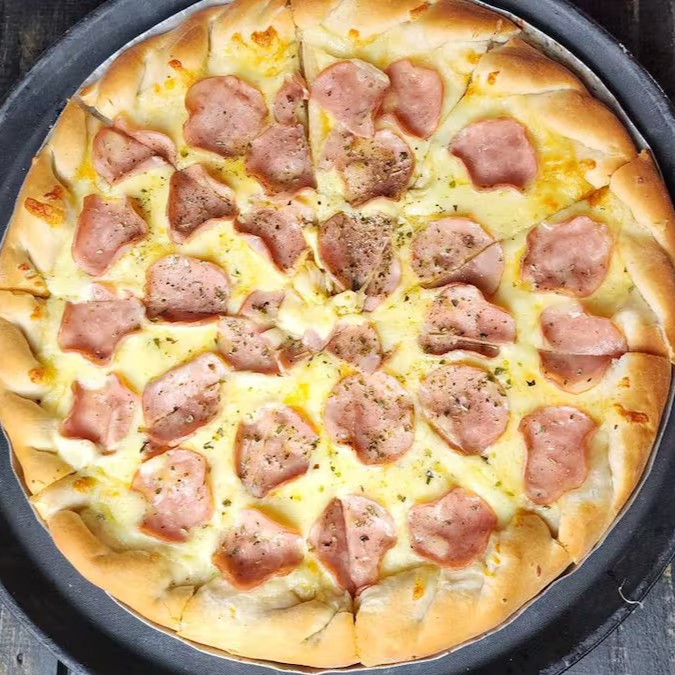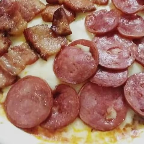 Massa Tradicional, Molho de Tomate, Muçarela, Calabresa, Presunto, Bacon, Cebola e Orégano.