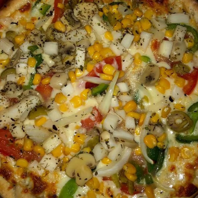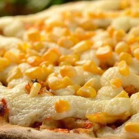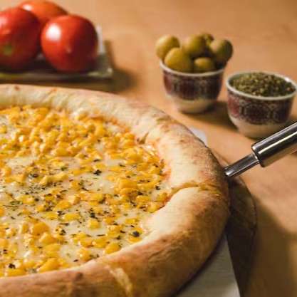 Massa Tradicional, Molho de Tomate, Muçarela, Milho, Tomate e Orégano.