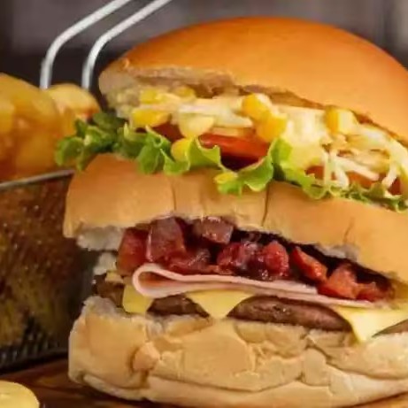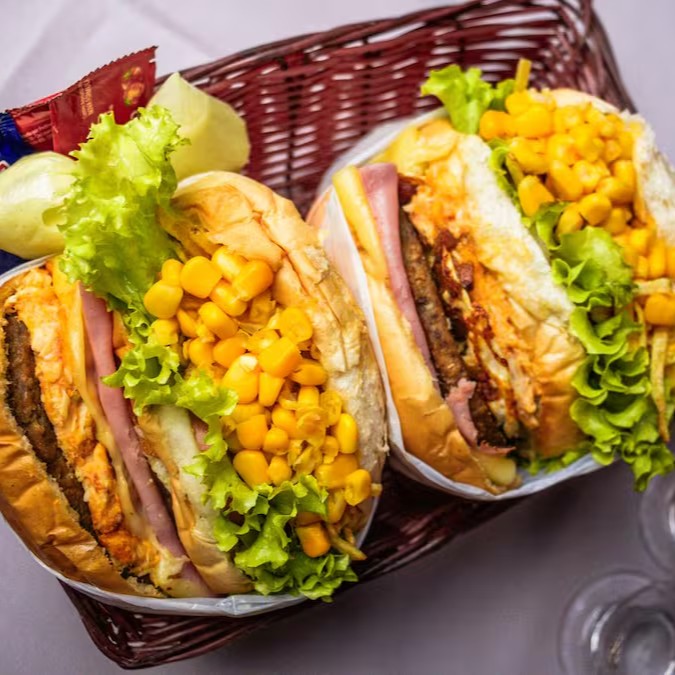 Cada Hambúrguer Vem: Pão , Carne De Hambúrguer Bovino, Queijo Mussarela, Presunto, Ovo, Frango Desfiado, Bacon, Milho, Abacaxi, Alface, Tomate, Batata Palha e Maionese.