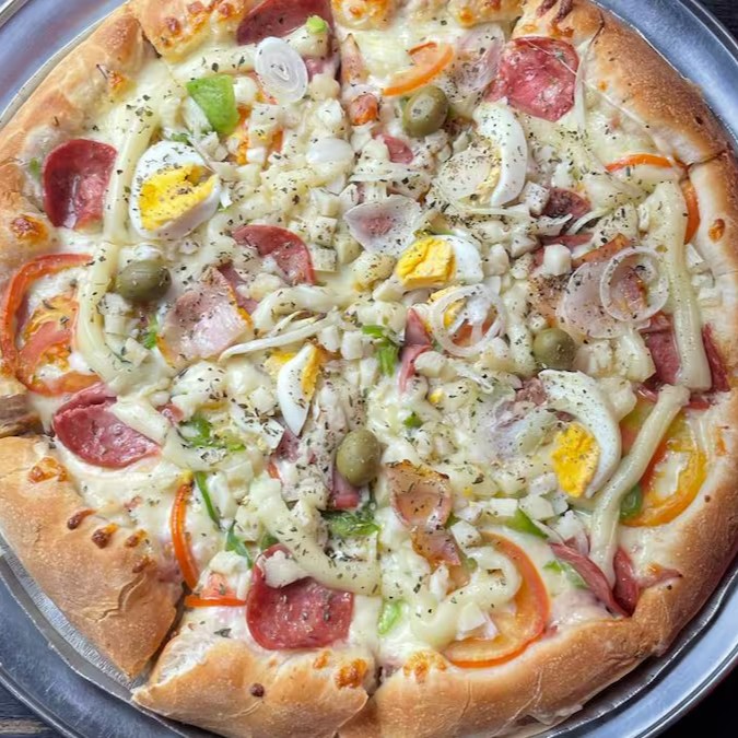 Massa Tradicional, Molho de Tomate, Muçarela, Presunto, Tomate, Pimentão, Calabresa, Azeitona, Ovo e Orégano.