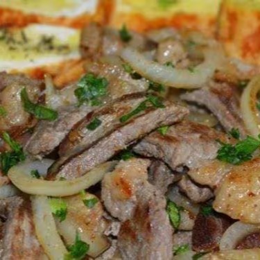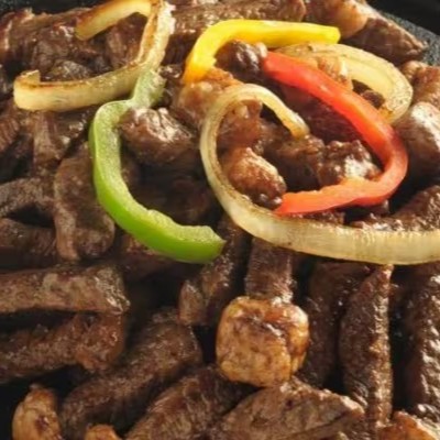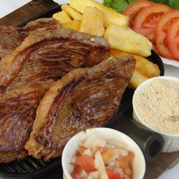 300g De Carne, Delicioso Contra Filé, Que Acompanha Cebola, Pimentão, Tomate. Carne Macia Com Muita Suculência. 400g de Fritas ou mandioca