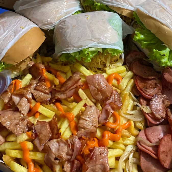 5 X-egg bacon +500g de batata+ 190g de calabresa +bacon +cheddar +cebola+ molhos.