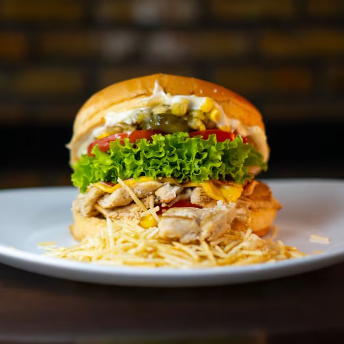 Pão, Frango Desfiado, Catupiry, Milho, Alface, Tomate, Batata Palha e Maionese.