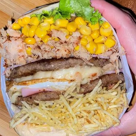 Pão, 2 Carnes 90g, Bife de Lombo, Queijo, Presunto, Ovo, Bacon, Frango Desfiado, Catupiry, Abacaxi, Milho, Alface, Tomate, Batata Palha e Maionese.