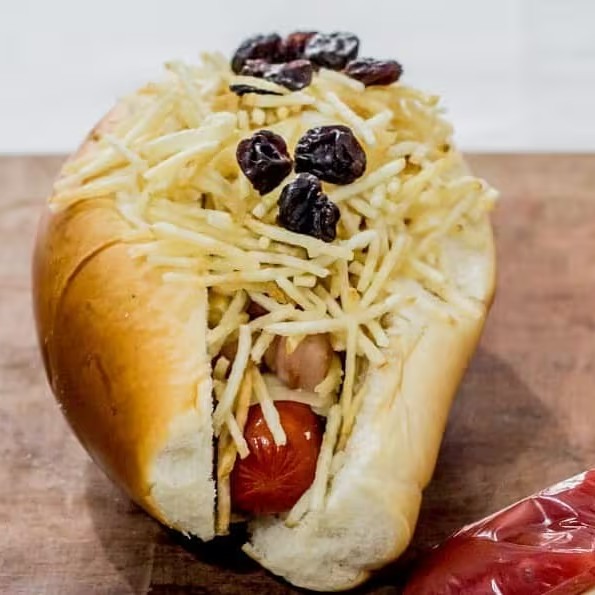 Salsicha, Mussarela, Molho, Milho, Batata Palha, Uva Passas.