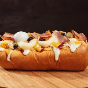 2 Salsichas, Mussarela, Molho, Catupiry, Bacon, Frango Desfiado, Milho, Batata Palha, Uva Passas.