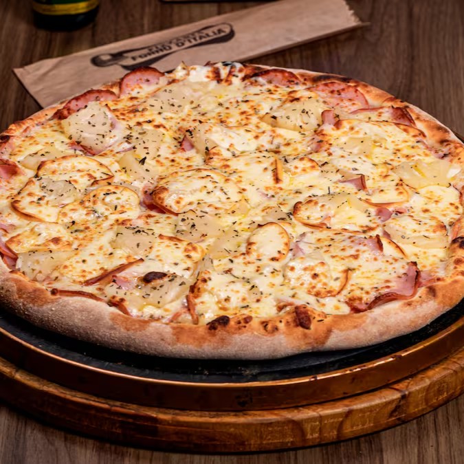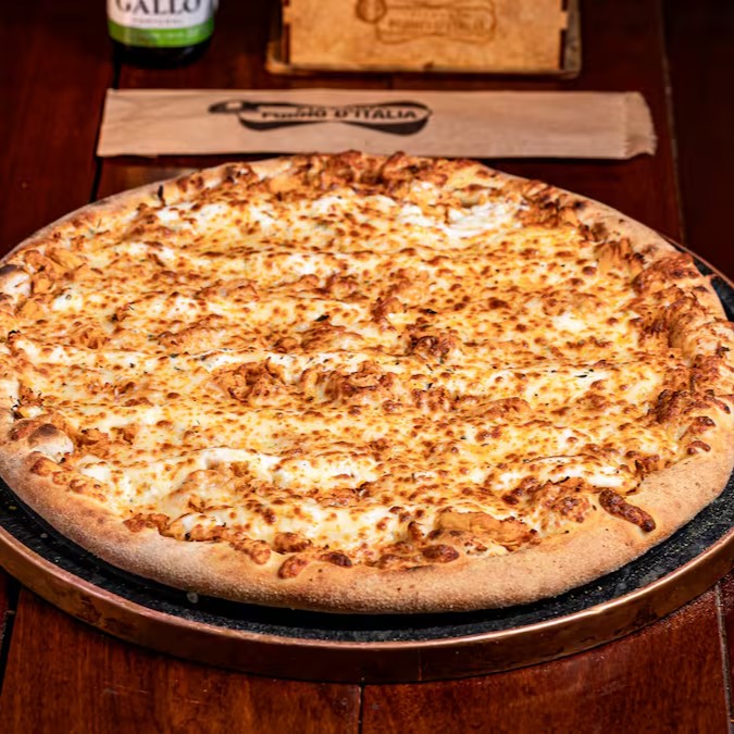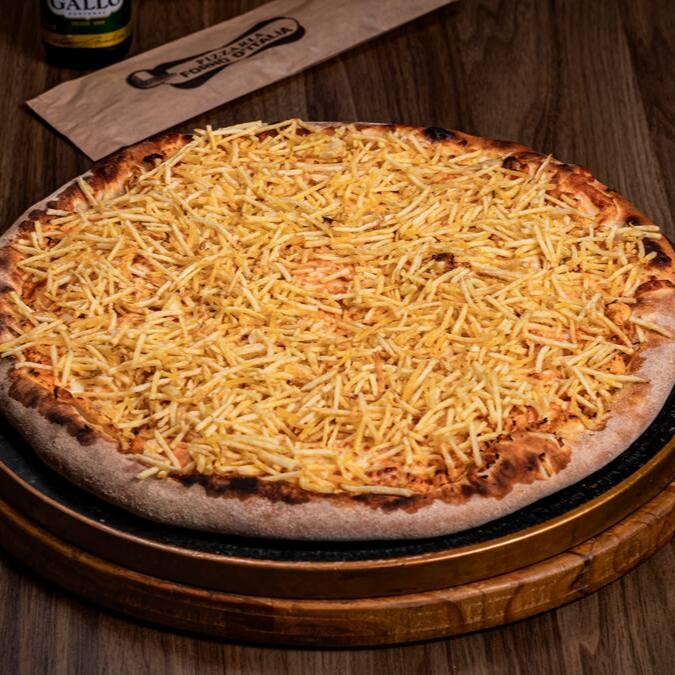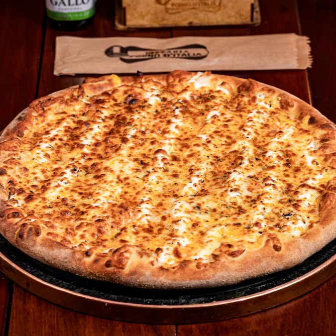 Molho, mussarela, parmesão, provolone, Catupiry e orégano.