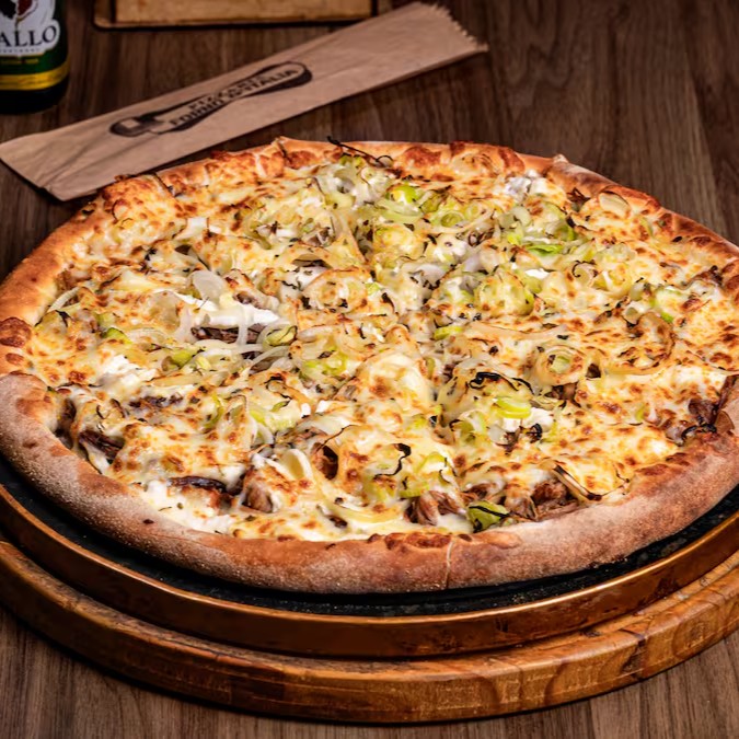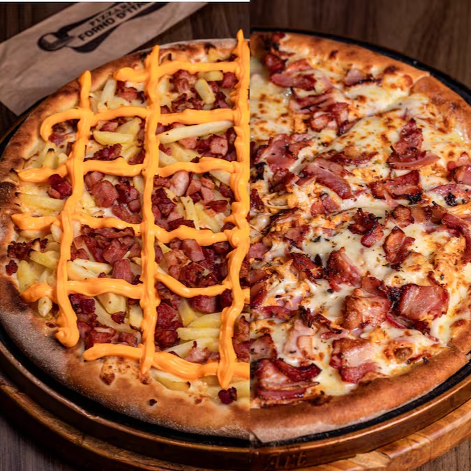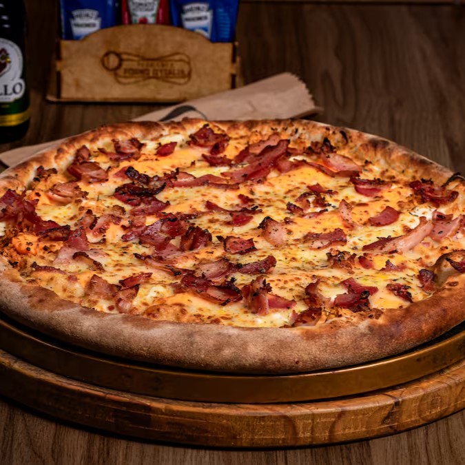 Molho Artesanal, Frango Desfiado, Requeijão Cremoso, Cheddar, Mussarela, Bacon Fatiado e Orégano.