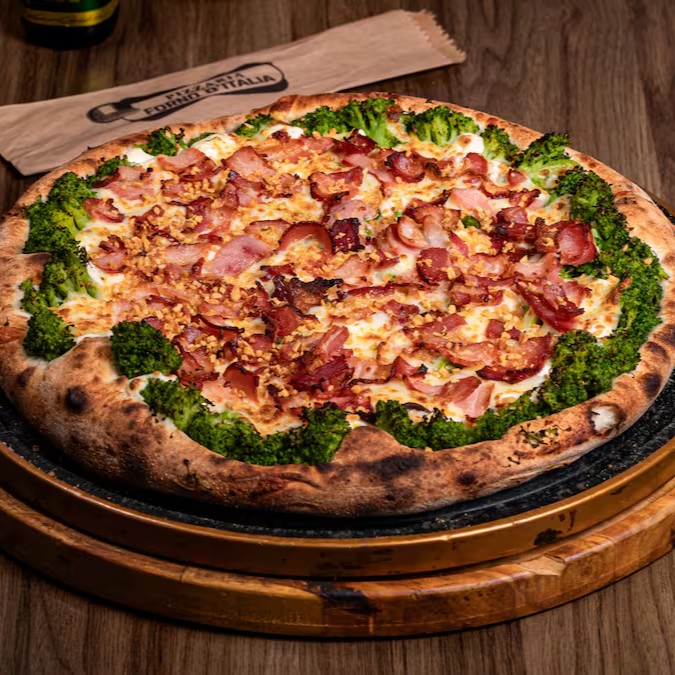 Molho Artesanal. Brócolis (cozido no vapor e temperado com ervas finas),Bacon, Creme de Queijo (Especial do Chefe),Mussarela e Alho Frito.