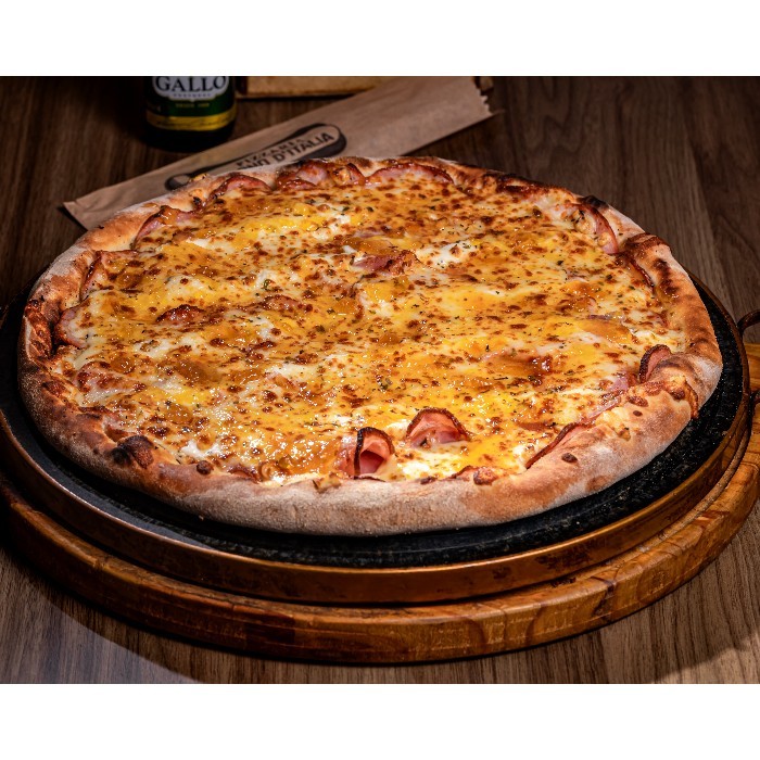 Molho Artesanal.Presunto,Calabresa, Lombo Canadense,Frango Desfiado,Mussarela, Bacon e Oregano.