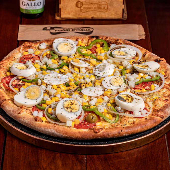 Mussarela, Presunto, Milho, Calabresa, Frango Desfiado, Bacon, Ovo, Tomate, Cebola, Pimentão, Orégano e Azeitona.