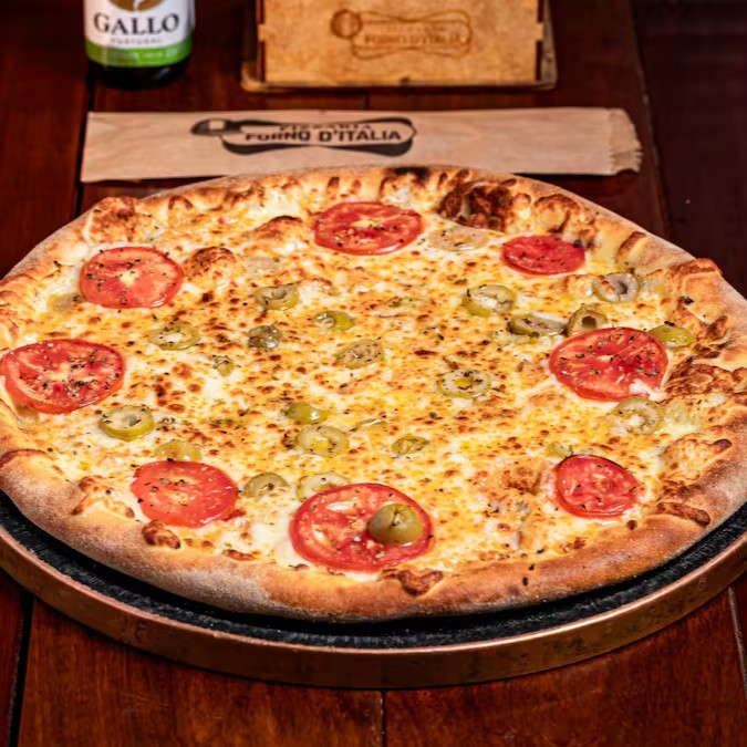 Mussarela, Presunto, Tomate, Cebola, Pimentão, Orégano e Azeitona.
