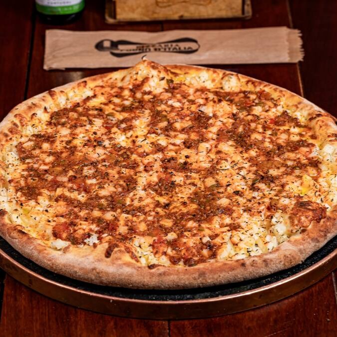 Molho Artesanal. Mussarela. Carne Seca. Requeijão Cremoso, Cebola,Alho Poro e Orégano.