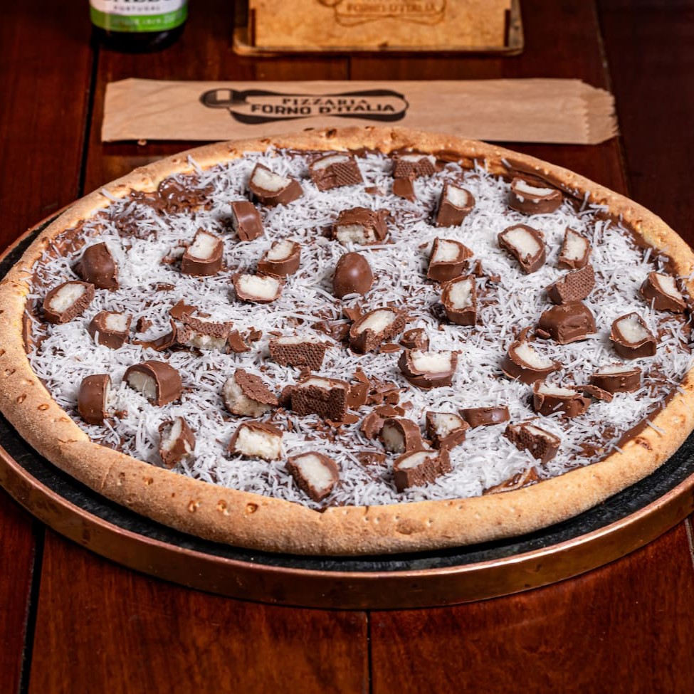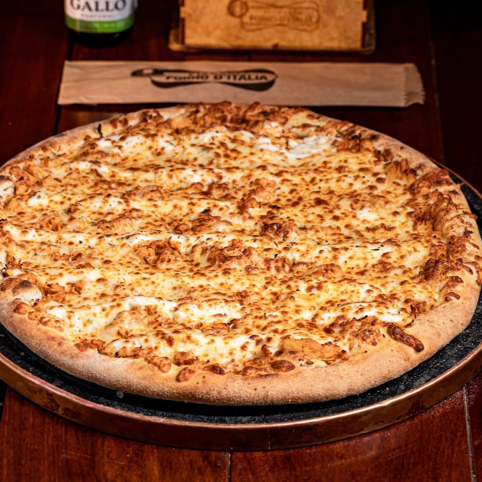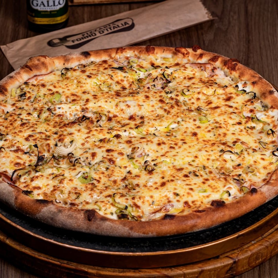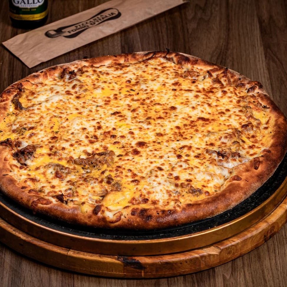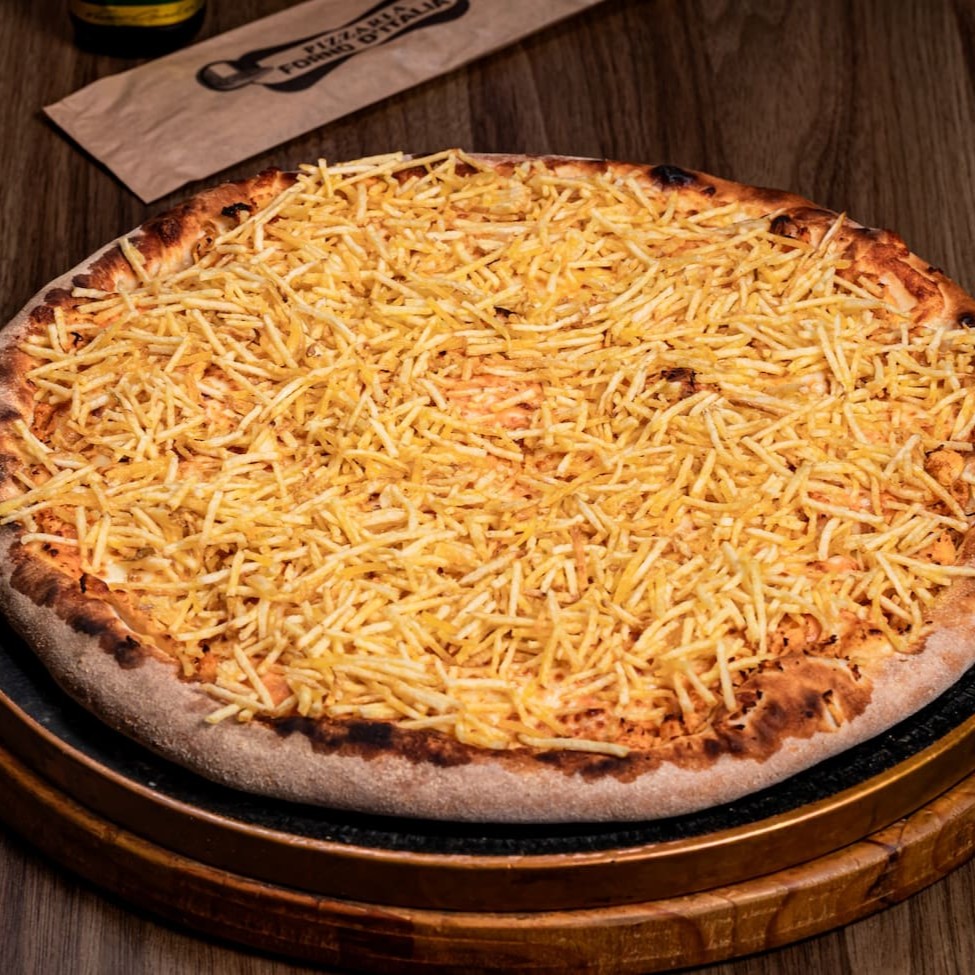 Molho, mussarela, parmesão, provolone, Catupiry e orégano.