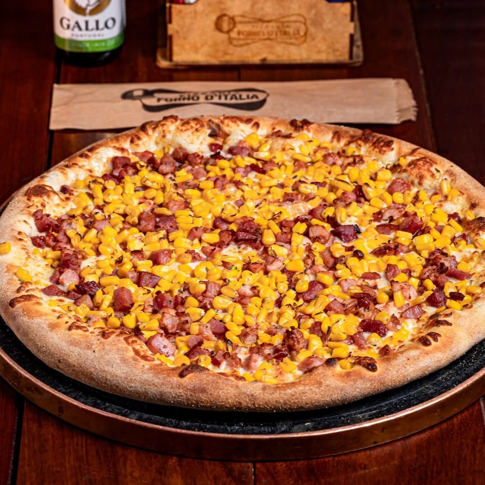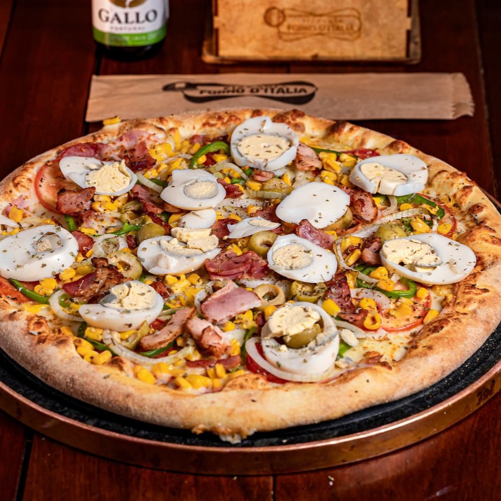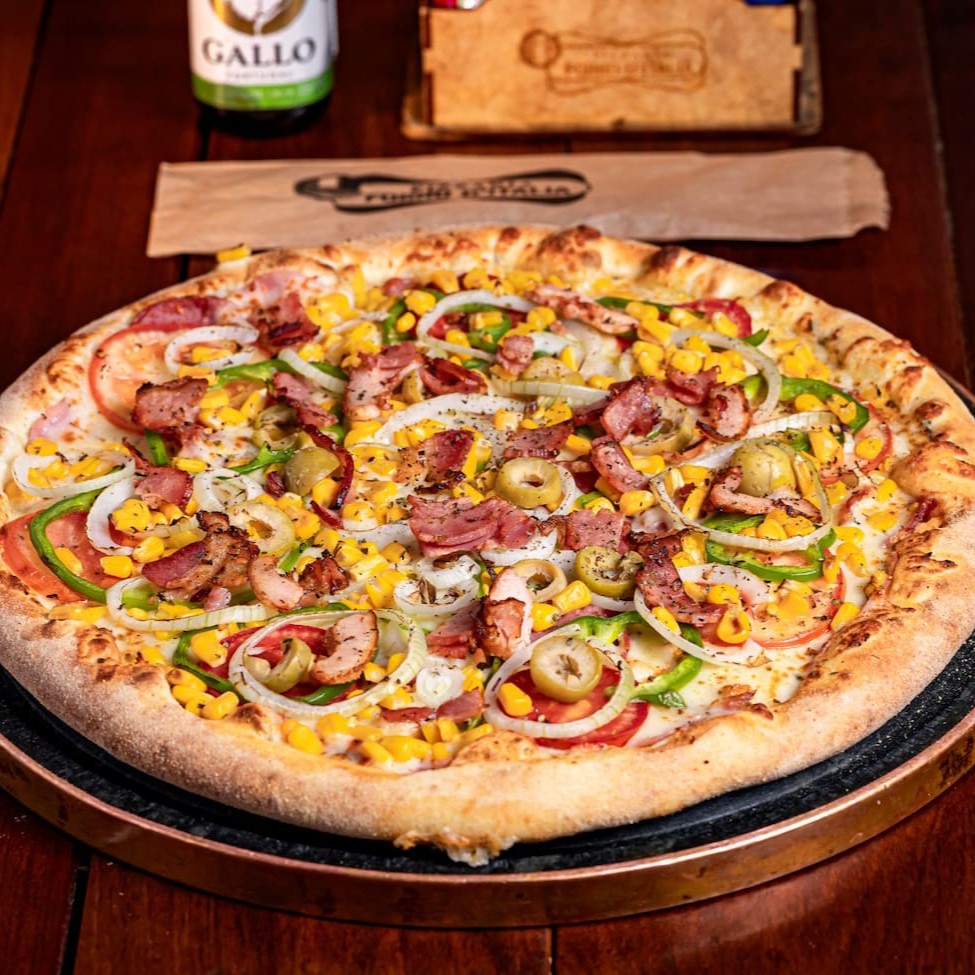 Mussarela, Presunto, Milho, Calabresa, Frango Desfiado, Bacon, Tomate, Cebola, Pimentão, Orégano e Azeitona.