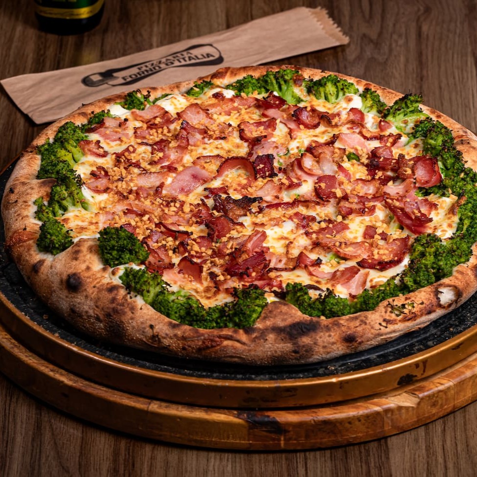Molho, Mussarela, Brócolis(cozido no vapor e temperado com ervas finas), Bacon, Creme de queijo (especial do chefe) e Alho frito.