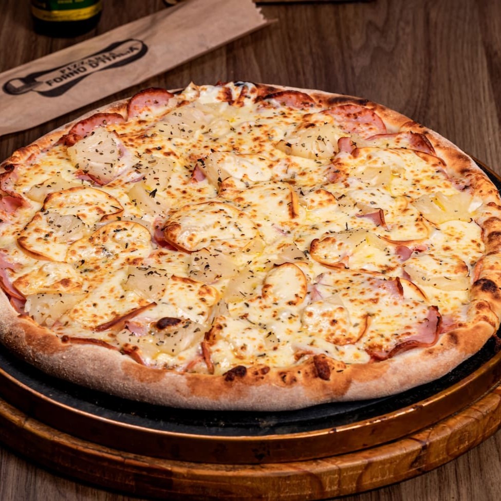 Molho Artesanal. Mussarela. Lombo Canadense. Provolone, Abacaxi e Orégano.