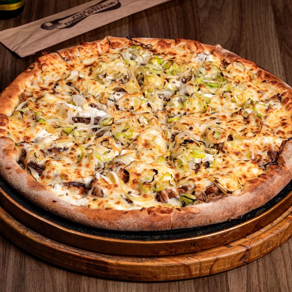 Molho Artesanal, Fatias de Peito de Peru, Alho Poró, Requeijão Cremoso, Mussarela e Orégano.