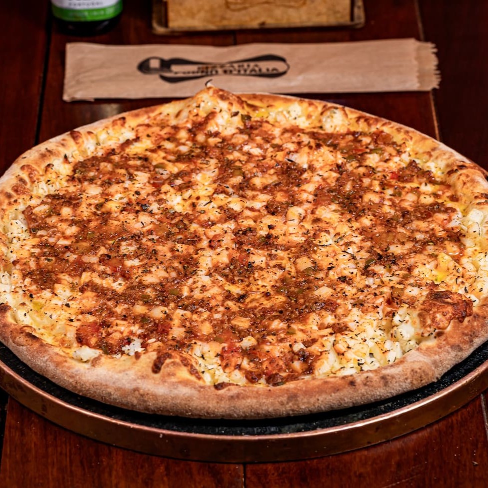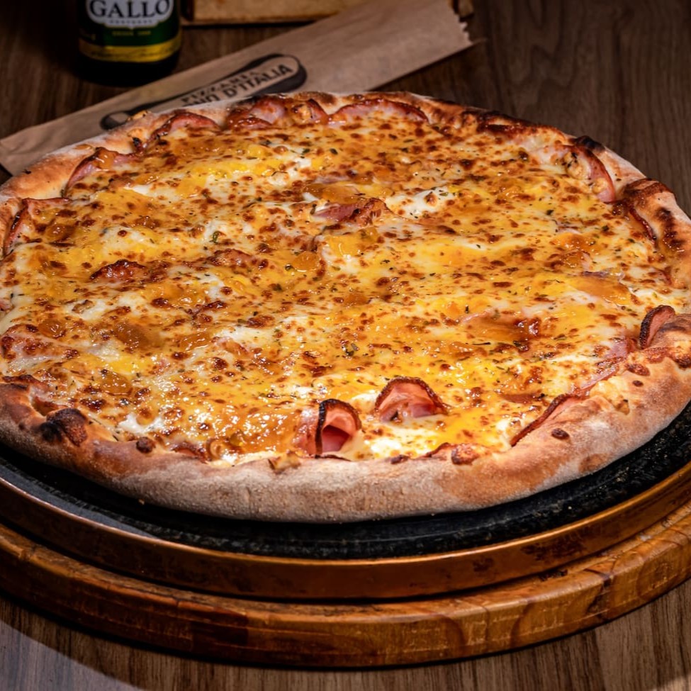 Molho Artesanal. Presunto, Calabresa, Lombo Canadense, Frango Desfiado, Mussarela, Bacon e Orégano.