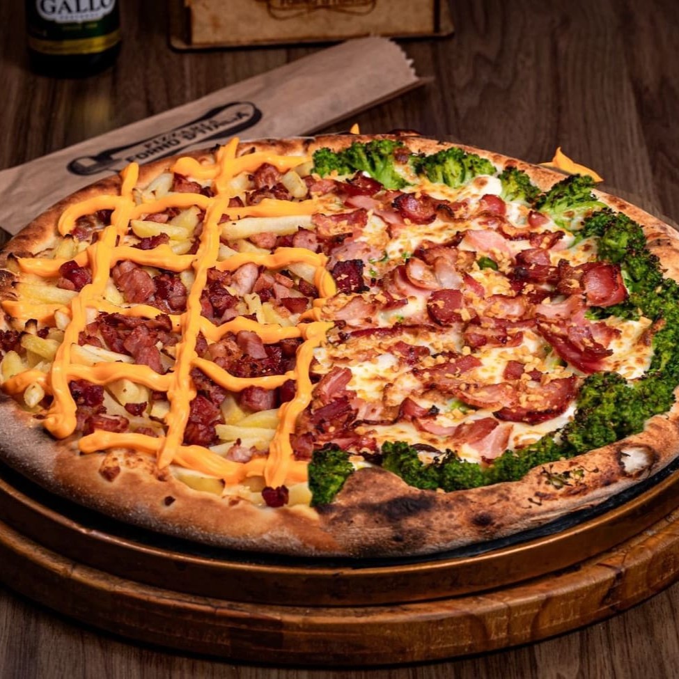 Molho Artesanal, Frango Desfiado, Requeijão Cremoso, Cheddar, Mussarela, Bacon Fatiado e Orégano.