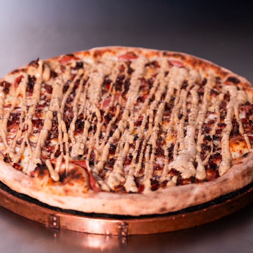 Molho, Mussarela, Calabresa, Bacon Crispy, Delicioso molho de mostarda e mel e óregano.