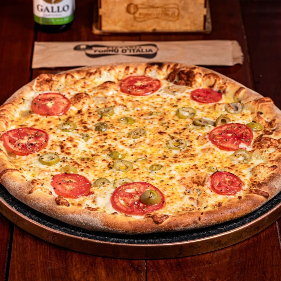 Mussarela, Presunto, Tomate, Cebola, Pimentão, Orégano e Azeitona.