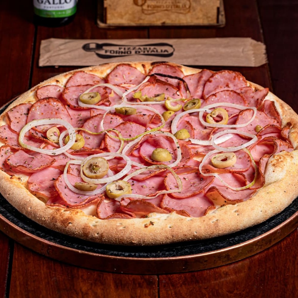 Mussarela, Lombo Canadense, Cebola, Orégano e Azeitona.