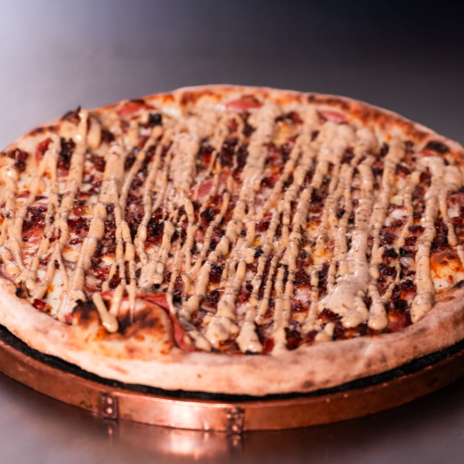 Molho, Mussarela, Calabresa, Bacon crispy, Delicioso molho de mostarda e mel, Oregano.