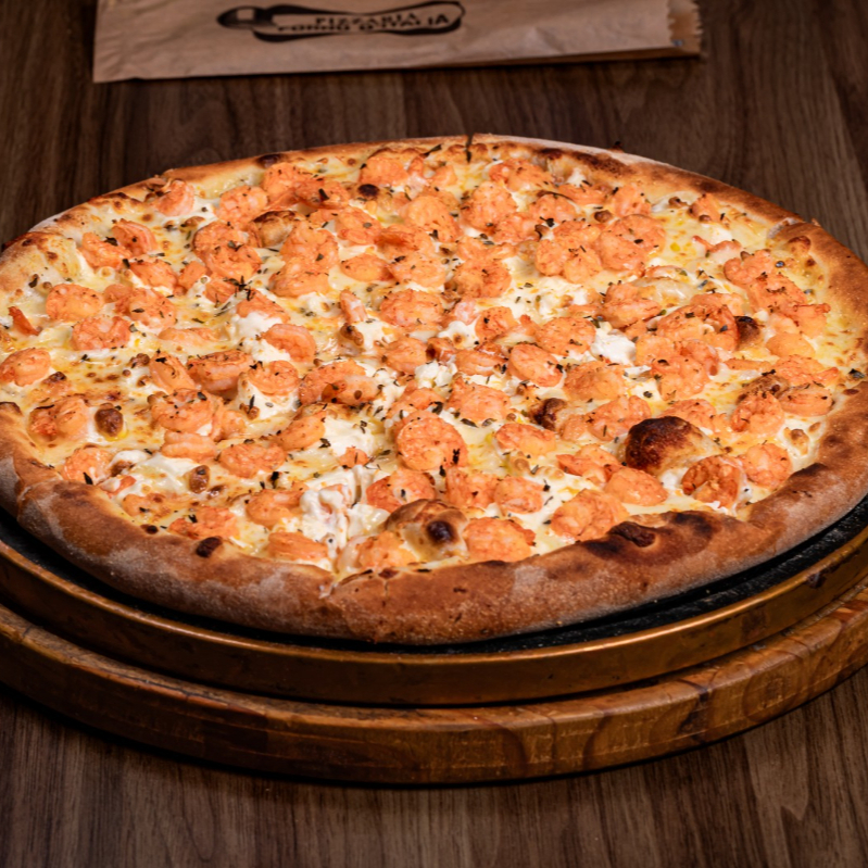 Molho, mussarela, requeijão cremoso, camarão e orégano
