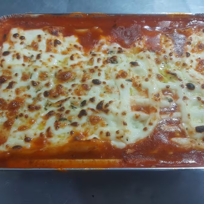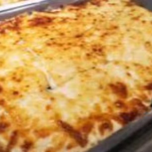 Molho branco, massa tradicional de lasanha, frango, Catupiry, milho, bacon, mussarela