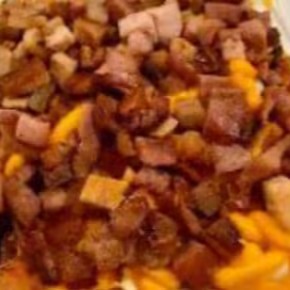 Molho à bolonhesa, 300 g de macarrão , mussarela, bacon, milho, cream cheese