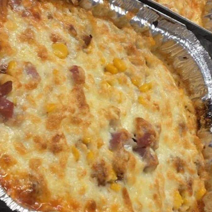 Molho à bolonhesa, mussarela derretida, milho e bacon crocante.