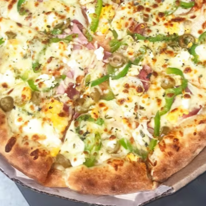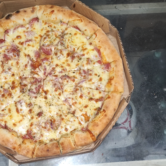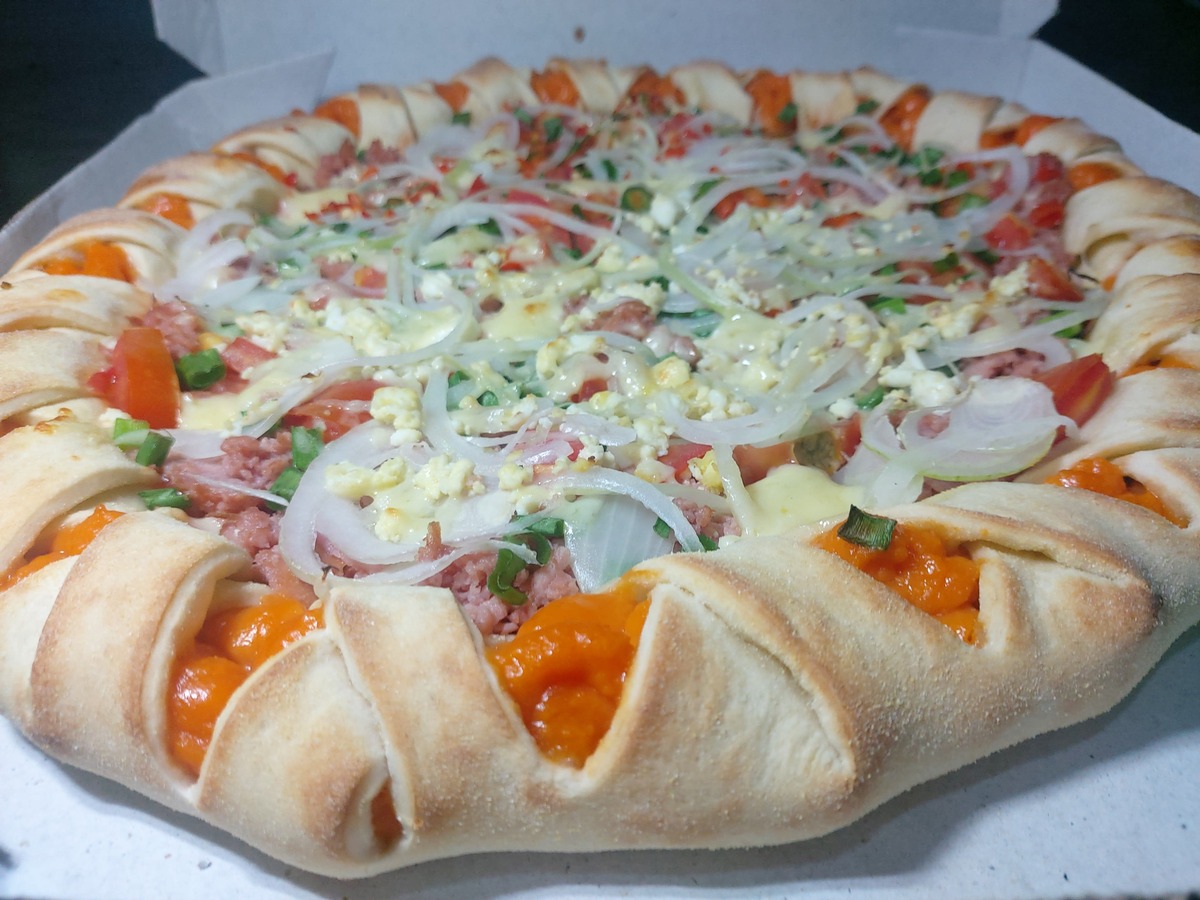 Molho de tomate, mussarela, calabresa, cebola e orégano