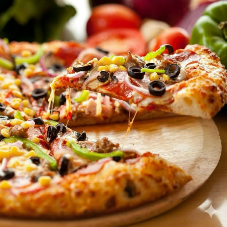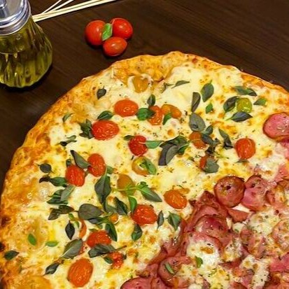 molho pomodoro, muçarel, presunto, calabresa, cebola, milho, pimentao, azeitona, molho pesto, oregano