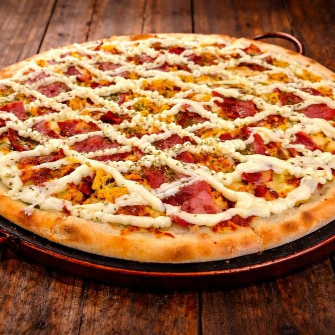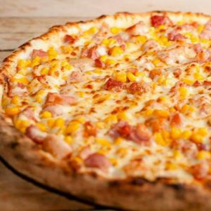 MOLHO POMODORO, MUÇARELA, MILHO, BACON, MOLHO PESTO, OREGANO