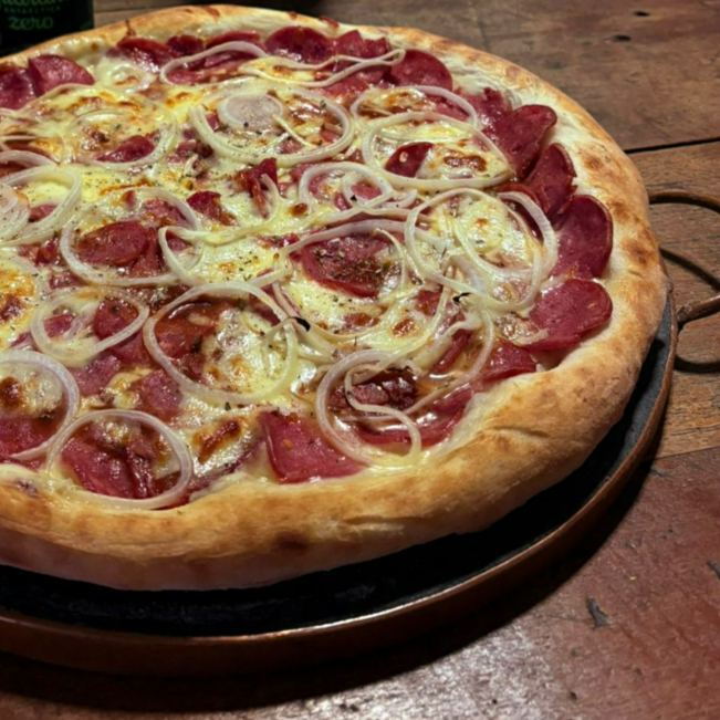Molho pomodoro, mussarela, calabresa, cebola, molho pesto, oregano
