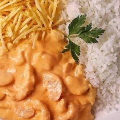 Arroz Branco,Strogonoff De Frango e Batata Palha.