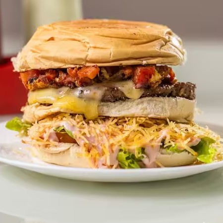 Pão macio recheado com 2 hambúrgueres de 90g, 2 ovos na chapa, mussarela derretida, presunto, bacon crocante e peito de frango desfiado bem temperado. Finalizado com batata palha, salada fresca e nosso molho especial da casa. Um lanche pra matar a fome de verdade!