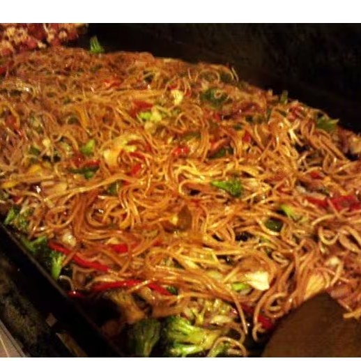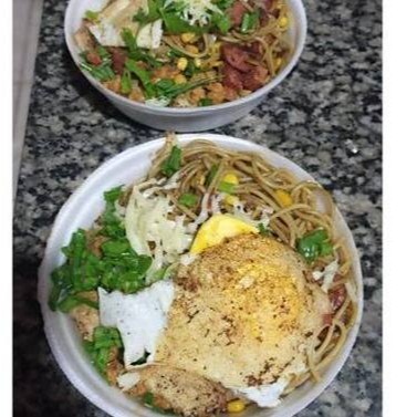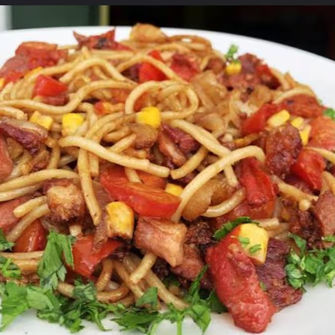 Espaguete, Bacon, Calabresa, Frango Desfiado, Cebola, Tomate ,Milho ,Mussarela, Shoyo e Cebolinha.