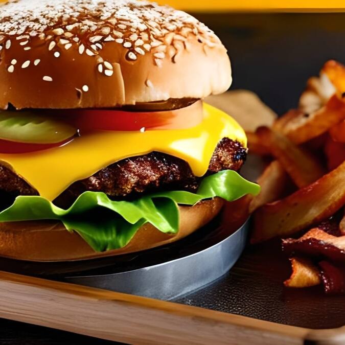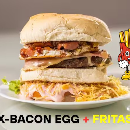 O 'X-Egg Bacon' é um hambúrguer suculento de 90 gramas, cuidadosamente grelhado até a perfeição. Servido num pão macio e fresco, é generosamente coberto com uma camada de queijo mussarela derretido e fatias de presunto saboroso. Para uma explosão de sabor extra, adicionamos um ovo perfeitamente frito e crocantes tiras de bacon. A batata palha, crocante e dourada, adiciona uma textura irresistível. A salada fresca e crocante equilibra perfeitamente os sabores ricos, enquanto nosso molho especial secreto proporciona o toque final perfeito. Uma experiência culinária verdadeiramente indulgente, perfeita para os amantes de hambúrgueres.