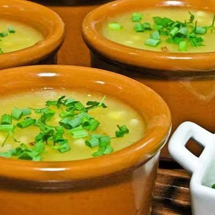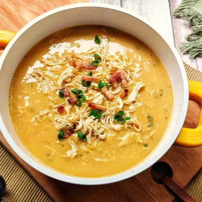Um caldo cremoso e caseiro feito com mandioca bem cozida, peito de frango desfiado e finalizado com um toque generoso de cebolinha fresca. Perfeito para aquecer e confortar, com aquele sabor que lembra comida feita com carinho.