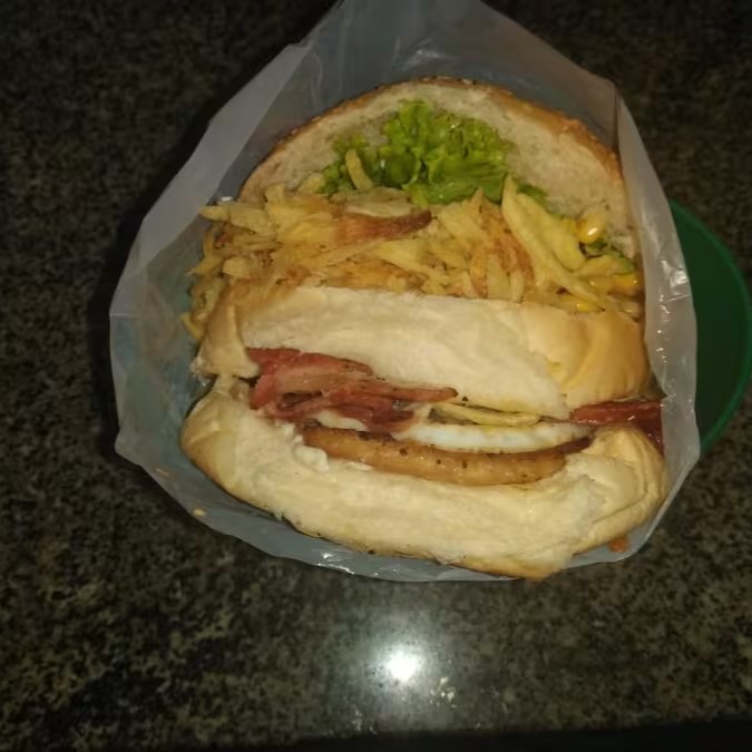 Pão, 1 hamburguer de boi, 2 hamburguer de frango, ovo, bacon, Catupiry, milho, batata e salada
